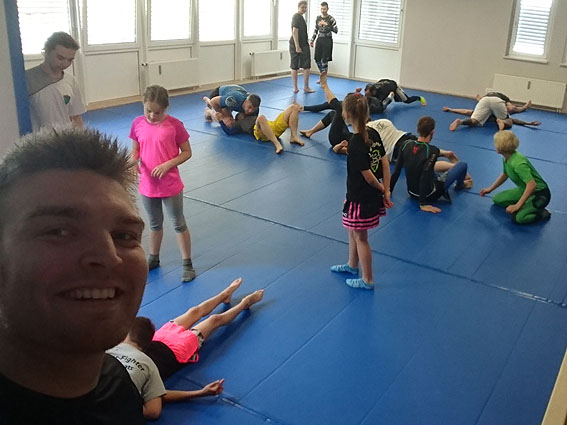 Die Einheit startete 14 Uhr mit gemeinsamem Aufwärmen und einer kurzen Technikeinheit von mir, um einen kleinen Überblick über den Kenntnisstand der Teilnehmer zu bekommen. Einige der Anwesenden hatten bisher noch keine Grapplingerfahrungen gesammelt. Es war aber faszinierend für mich zu beobachten, wie sich anfängliche Skepsis bereits während der kurzen Einführung in Begeisterung wandelte. Wir übten – sozusagen um einander kennen zu lernen – gemeinsam, wie man einem Jab, einer unvermittelt mit der Führhand (meist links) geschlagenen Geraden, ausweicht und mit einem Wurf den Gegner zu Boden bringt und mit einem anschließenden North-South Choke zur Aufgabe zwingt.