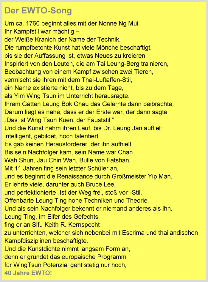 Im letzten Jahr hat mir Cosimo My eine Wohnung direkt über seiner WT-Schule in Bad Wildungen vermietet. Und er wusste ja, dass ich Musik mache. Irgendwann fragte er mich dann, ob ich nicht Lust hätte, einen Song zum 40-jährigen Jubiläum der EWTO zu schreiben. Da konnte ich natürlich nicht widerstehen und habe sofort zugesagt. Cosimo drückte mir zur „Vorbereitung“ das Buch „Die Essenz des WingTsun“ in die Hand, und daraus habe ich mir dann die wichtigsten Sachen rausgeschrieben, zusammengefasst und schon war das Lied so gut wie fertig.
