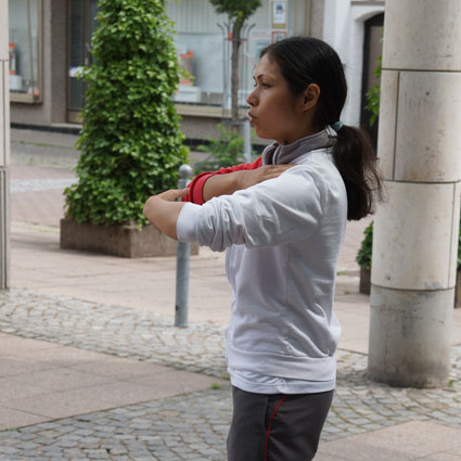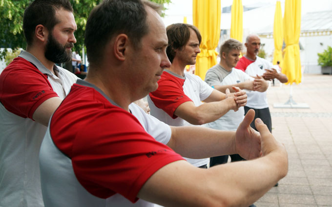 Ein wenig Entspannung gab es wenigstens beim ChiKung-Team; denn sie zeigten nicht nur physische Übungen für eine starke Mitte, sondern stellten auch im mentalen Bereich her eine psychische Balance her. Wie immer hatten die Meister Constantin Mock, Regula Schembri und Petra Weipert viele Übungen für Kräftigung, Dehnung und Entspannung in petto. Dieses Mal lag der Schwerpunkt dabei auf dem Training für eine starke, stabile und doch flexible Mitte, wo es nicht so sehr um die großen Muskelgruppen, sondern eher um die kleinen stabilisierenden Haltemuskeln geht, die gern vernachlässigt werden – aber im WingTsun enorm wichtig sind. Nicht umsonst betont GM Kernspecht immer wieder: „Rumpf ist Trumpf!“