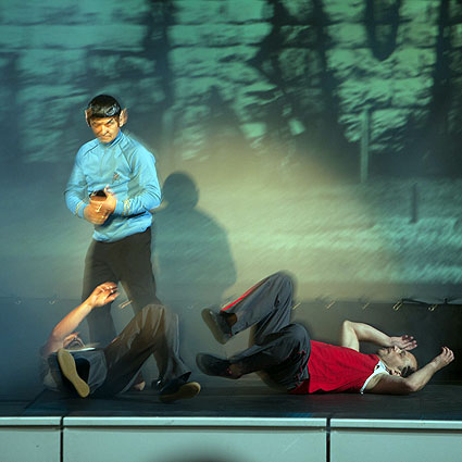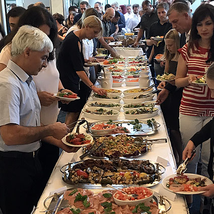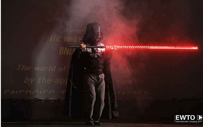 Nach zwei Tagen mit nach so viel intensivem Lernen hatten sich alle etwas Entspannung verdient. Wo kann man das besser als bei der Abendveranstaltung? Ein Sektempfang zur Einstimmung, ein tolles Buffet zur Stärkung, ein kühles Getränk zur Erfrischung und dann einfach zurücklehnen und das Programm des Abends genießen. Für die WingTsun-Unterhaltung sorgten Meister Ahmed Al-Jabaji & Oliver Murbach aus der Schweiz. Darth Vader und sein Laserschwert ließen grüßen – ein völlig neues Ambiente für die Langstockform. Weitere gut choreografierte WingTsun-Darbietungen der beiden WingTsunler folgten. Aber auch sie wurden schließlich besiegt: durch das Einschreiten von Mister Spock alias GM Giuseppe Schembri.
