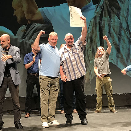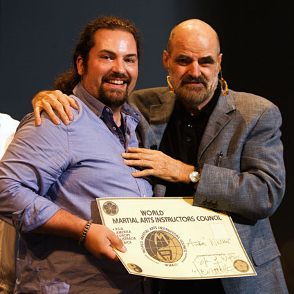 Für GM Bill Newman war dieser Lehrgang ein Anlass zu großer Freude: Konnte er doch bei der Abendveranstaltung zwei neue 3. HG im Escrima ernennen. Außerdem erhielt Falk Welker die Ernennungsurkunde zum 5. Meistergrad im Escrima. Aber der Höhepunkt war sicherlich, dass er seinem langjährigen Schüler Bernd Hoyer zum bestandenen 7. Escrima-Meistergrad gratulieren konnte. Riesenjubel nicht nur beim Escrima-Chef, sondern im ganzen Festsaal.