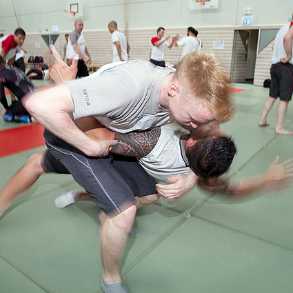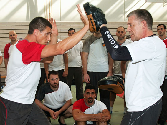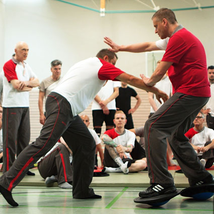 Bei den Großmeistern Oliver König und Thomas Schrön wurden unter den Oberbegriffen BlitzFight und BlitzDefence Grappling- und Stand-up-Techniken, Drills für Schlag- und Trittkraft auf den verschiedenen Niveaus geübt, ein Anti-Überfall-Progamm und Selbstverteidigungsstrategien am Boden vorgestellt. Hier gab es sozusagen Technik für die Routine und Strategien fürs Überleben im Doppelpack. In der eigens dafür mit Matten ausstaffierten Mehrzweckhalle herrschte die ganzen Tage reger Betrieb – zur Verwunderung von GM O. König besonders in der letzten Einheit am Tag. Ein dazu befragter Teilnehmer gab die klärende Antwort: „Hier ist Auspowern und Action angesagt. Das gleich in den ersten Einheiten am Tag und man wäre für den Rest zu kaputt gewesen und hätte dort nichts mehr mitbekommen. Deswegen habe ich mir diese letzte Einheit des Tages ausgesucht. Anschließend ab unter die Dusche und ins Bett fallen. Aber am nächsten Morgen bin ich dann wieder voll fit.“ Das nennt man dann wohl Strategie …