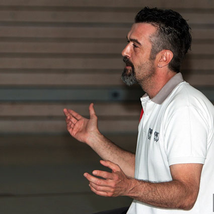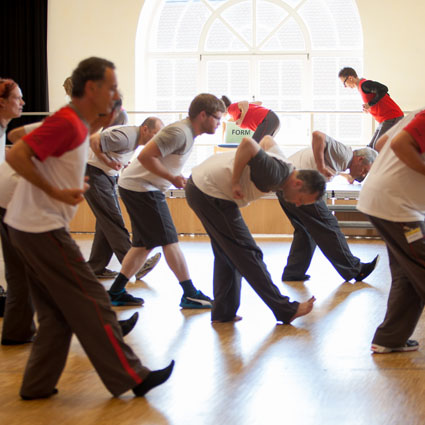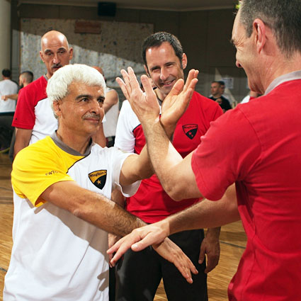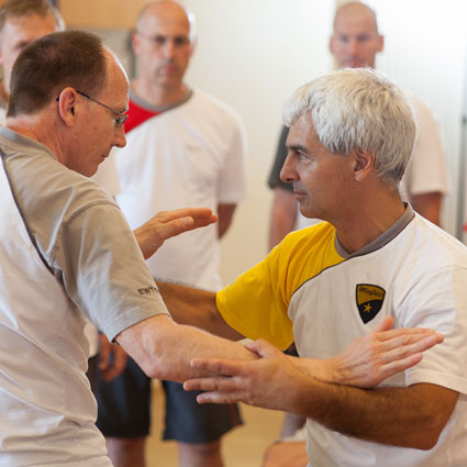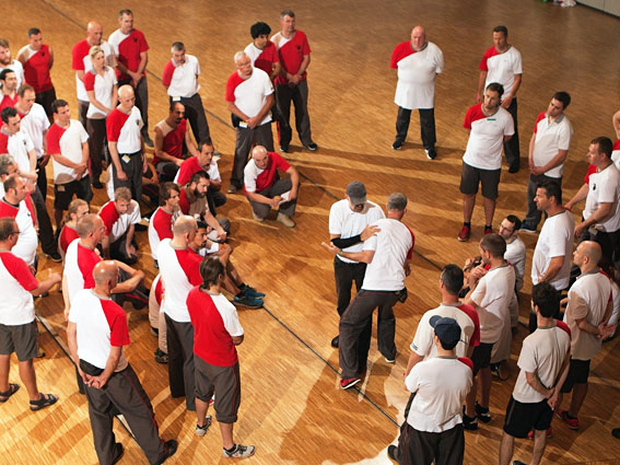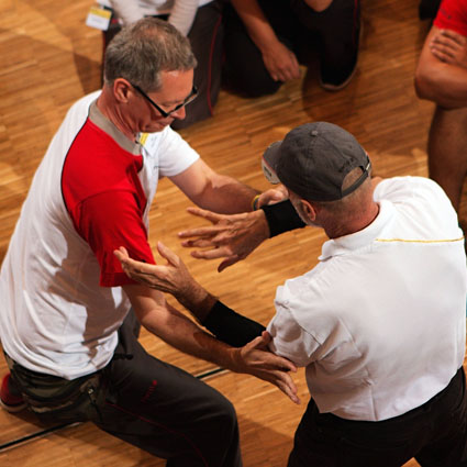 Viele mussten nicht weit gehen und blieben gleich im großen Saal der Hockenheimer Stadthalle, um dort bei Großmeister Giuseppe Schembri die Formen neu zu erarbeiten. Dieses Mal stand nämlich nicht der technische Ablauf auf dem Programm, sondern wie man durch strategisch kluges Lernen am meisten aus den Formen für sein Bewegen ziehen kann. Da gab es eine Menge Aha-Erlebnisse – nicht nur bei den Schülergraden. Auch Meister erlebten die Formen zum Teil auf eine neue Art und Weise: als Übungsraum und Bereicherung für ihr iWT. Im Laufe des Tages folgten dann bei GM Schembri noch Einheiten zu den Themen ChiSao, LatSao, Mitfließen und wie man mit Widerstand umgeht. Diese Themen wiederholten sich an den folgenden Tagen, so dass jeder Gelegenheit hatte, alle Themen bei GM G. Schembri – einige natürlich entsprechend der Graduierung zu besuchen.