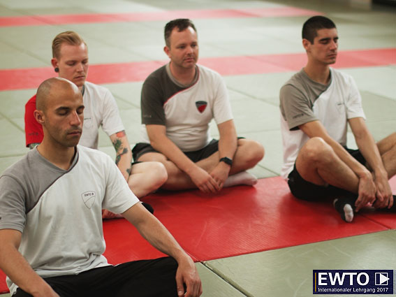Abgerundet wurde das Lehrgangsprogramm u.a. von Unterrichtseinheiten bei Meister Jürgen Kestner und Dr. Hubert Beitler, die ihren Teilnehmer/innen die Erhaltung der physischen und psychischen Balance unter Extrembelastungen näherbrachten. Die Extrembelastungen wurden auf unterschiedliche Art und Weise erzeugt – unter anderem durch laute Diskomusik. Dabei bei der Sache und handlungsfähig zu bleiben, war schon nicht ganz einfach.