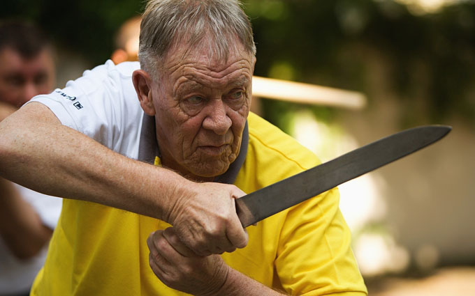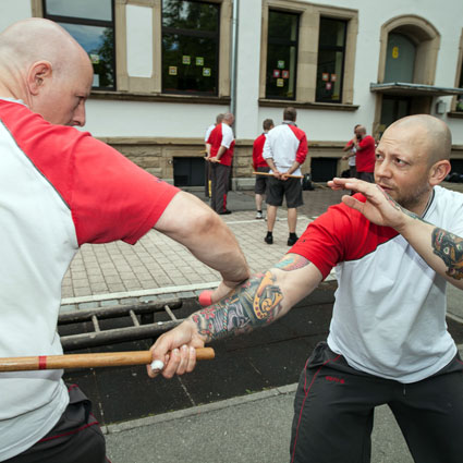 Nicht fehlen durfte selbstverständlich intensiver Escrima-Unterricht in drei bis vier Unterrichtseinheiten pro Tag bei Großmeister Bill Newman und seinem Team. Sie hatten wieder den Schulhof der angrenzenden Pestalozzi-Schule zu ihrem Trainingsrevier erkoren. Je nach Graduierung wurde mit Holzstock, Kobutan, Tonfa, Messer, Escrima-Langstock oder Schwert geübt.