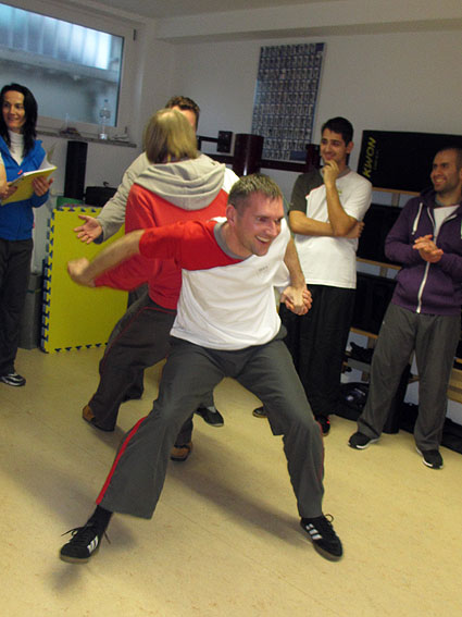 Trotz allem Spaß war das Wochenende kein Zuckerschlecken. DaiSifu Piet hatte so viel Unterrichtsstoff in der Theorie zu vermitteln, dass wir aufpassen mussten wie Luchse, um alles aufzunehmen. Aber das war nur eine Seite. Die praktischen Teile des Seminars sorgten nicht nur für die Festigung der theoretischen Inhalte, sondern auch für jede Menge Spaß. Wir konnten zwischendurch immer wieder wie Kinder spielen, was wir reichlich ausnutzten … Ich glaube, die Fotos sprechen für sich.