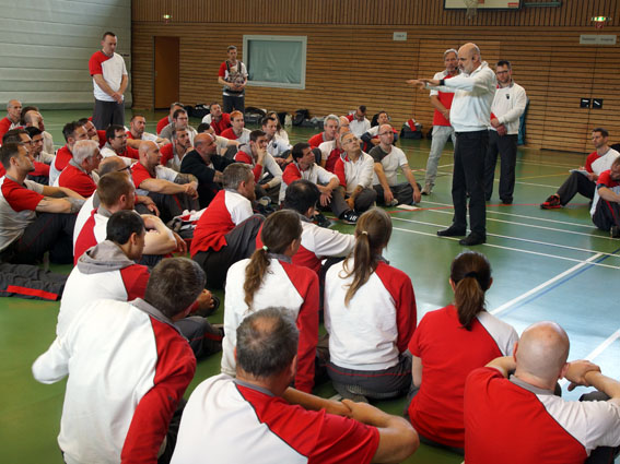 Am 13. und 14. Mai herrschte in der Biddersbachhalle in Wiesenbach reges Treiben, wie man es sonst von den Ausbilderlehrgängen her kennt. Nur sah man dieses Mal extrem viel Rot und kaum Grau und die Unterrichtenden waren ausschließlich Großmeister. Was war der Anlass?