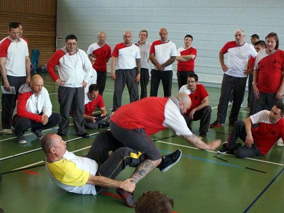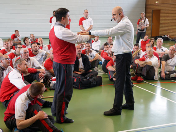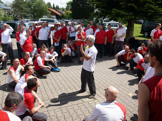 Großmeister Kernspecht ließ die anwesenden Schulleiter vorbehaltlos an seinem Wissen teilhaben. Es wurden eifrig Notizen gemacht, um dann zuhause noch einmal in Ruhe die für einige doch neuen Inhalte aufarbeiten bzw. verinnerlichen zu können. Für manche mochten die praktischen Beispiele wie Zauberei erscheinen, wenn man sah, mit welcher Mühelosigkeit der Großmeister seine Schulleiter/innen durch die Gegend schubste oder zog. Doch hinter allem steckten lediglich angewandte Prinzipien. Sie werden sicherlich das Üben nicht überflüssig machen, aber zumindest sehr viel schneller zum Verständnis des WingTsun-Bewegens und damit zum Erfolg führen.