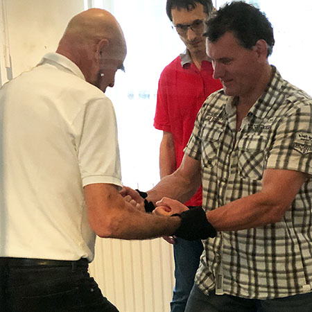 In dieser mittleren Distanz können Spezialisten allerdings durchaus noch Tritte und Schläge und schon Armhebel, Würger und Würfe realisieren.