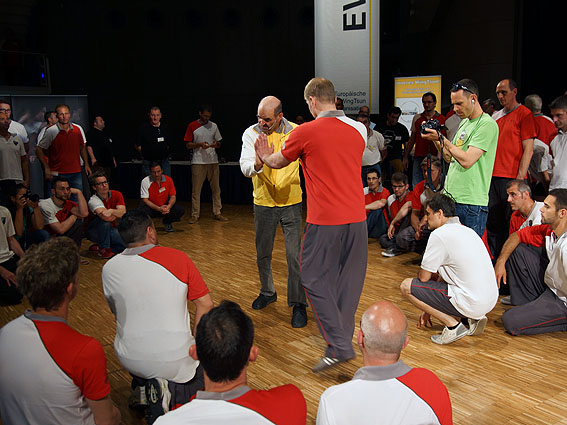 Für einige Meister endete der Prüfungsstress dann schon am Sonntagabend. Sie hatten ihre sich über mehrere Monate hinziehende mehrteilige Prüfung allesamt bestanden. Bei der Abendveranstaltung konnten sie ihre Urkunden schließlich in Empfang nehmen. Es wurden so viele Meister mit einer höheren Graduierung ausgezeichnet wie nie zuvor bei einem Int. Lehrgang der EWTO.