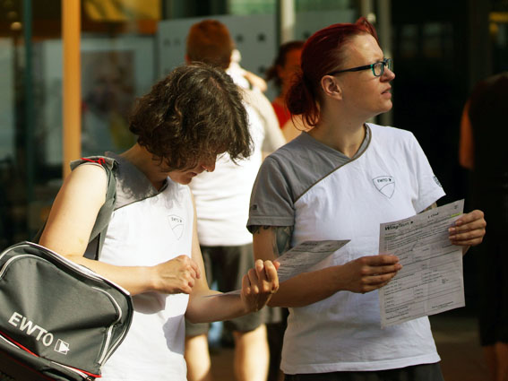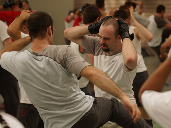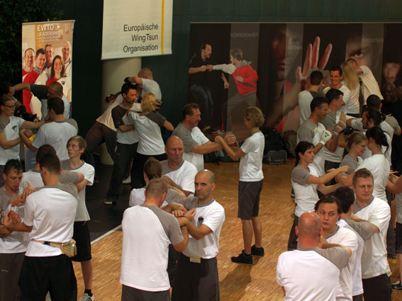Viel Zeit zur Erholung blieb dann weder den Referenten noch dem EWTO-Team; denn am folgenden Samstagmorgen begann pünktlich um 8.45 Uhr mit der Begrüßung der dreitägige Internationale Lehrgang. Bei täglich steigenden Höchsttemperaturen kamen in Hockenheim in diesem Jahr wieder WingTsunler, Escrimadores und ChiKungler zusammen, um gemeinsam zu trainieren, zu feiern und alte und neue Bekannte zu treffen. Und um zu schwitzen, wofür es allerdings mehrere Gründe gab: entweder waren es die Außentemperaturen, das Stresstraining, die Fightfit-Einheiten oder in dem einen oder anderen Fall vielleicht auch der Prüfungsstress.