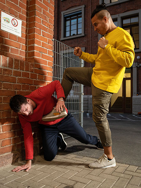 Die letzte Phase besteht nach der Analyse von Großmeister Kernspecht darin, dass wir zu Boden gegangen sind und nun mit Tritten zum Kopf und Körper rechnen müssen. Vielleicht kommen außerdem noch Freunde des Angreifers hinzu. Dann müssen wir uns auch noch gegen mehrere Gegner verteidigen. Eine ganz schön heikle Situation…