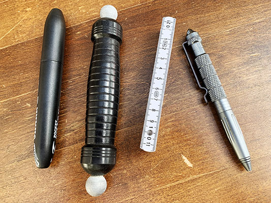 Mini-Zollstock, größeres Schlüsselbund, Handy, Fahrradreparaturwerkzeug, größerer Stift etc.