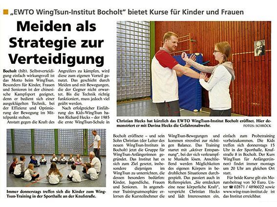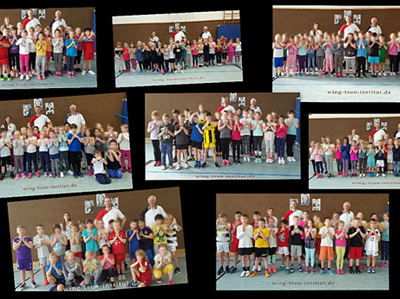 Eine Halle anzumieten, ist einfach. Die Schüler kommen dann von selbst – wohl kaum. Was tun? Eine meiner Töchter ist Lehrerin und schilderte Ereignisse bei der Pausenaufsicht. „Wie wäre es, wenn wir in der ganzen Schule für alle Klassen im Sportunterricht Kids-WingTsun vorführen würden?“ Meine Tochter war begeistert von der Idee und wir meldeten uns zum Fachtrainerlehrgang für Kids-WingTsun bei DaiSifu Peter Thietje an. Wir wussten, Erfolg hat man nur mit Qualität und dem richtigen Konzept – also nicht einfach nur Erwachsenen-WT auf die Kinder anwenden. Der Lehrgang zeigte uns, wie es richtig gemacht wird. Begeistert probierten wir das Gelernte dann in den verschiedenen Klassen aus. Die Kinder bekamen Zettel mit nach Hause, wann Kids-WingTsun von uns angeboten wird und außerdem ein Erinnerungsfoto.