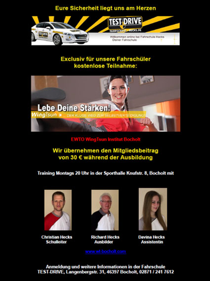 Die Frage war, wie bekommen wir mehr Schüler. Eine Idee, die wir auch mit unserem SiFu GM Kernspecht besprochen hatten, war die Verbindung von Fahrschule und WingTsun-Schule. Für Fahrschüler war das Thema Gewaltprävention interessant – besonders für von der Fahrschule unterrichtete Busfahrer ein großes Thema. Also auf zum Fachtrainerlehrgang EWTO-Gewaltprävention bei DaiSifu Roy Schirdewahn. Anschließend erhielten alle Fahrschüler folgenden Flyer: