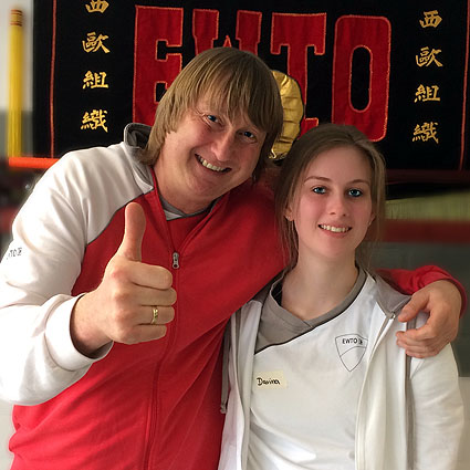 Seit dem ersten Kursus für Frauen-Selbstverteidigung und -Selbstbehauptung von Sifu Sabine Mackrodt aus Kassel in unserer Schule ist meine Tochter Davina dabei. Sie machte schnell Fortschritte und ist inzwischen Ausbilderin und Fachtrainerin für Kids-WingTsun und Frauen-Selbstbehauptung.
