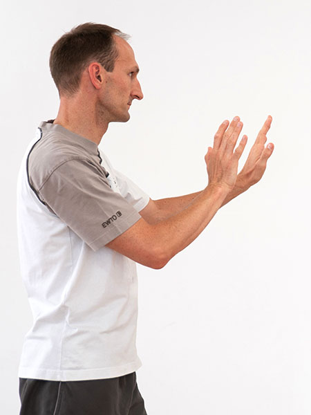 Steht der Angreifer so vor euch, gilt es, die Hände vor dem Körper bereit zu haben.