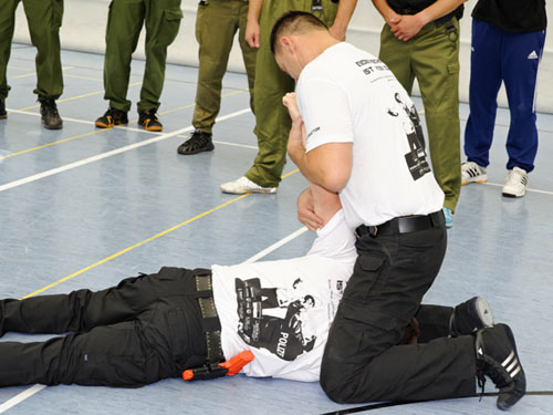 an die vier Blitzprogramme mit den Methoden der Selbstverteidigung von Großmeister Kernspecht und seinem Team vertraut gemacht. Darauf aufbauend konnten sich die Teilnehmer im Themenbereich „Zugriff und Fixierung“ noch näher an die Person „herantasten“, um sie auch im Stand zu fixieren und letztendlich durch ein kontrolliertes „Zu-Boden-Bringen“ festzulegen.